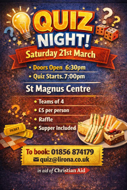 The Kirkwall Christian Aid Committee are organising a quiz night on 21st March in the St Magnus Centre. Doors open at 6.30pm and the quiz will start at 7pm. Teams of 4 – £5 per person (includes supper), and there will be a raffle. To book, phone 01856 874179 or email quiz@lirona.co.uk